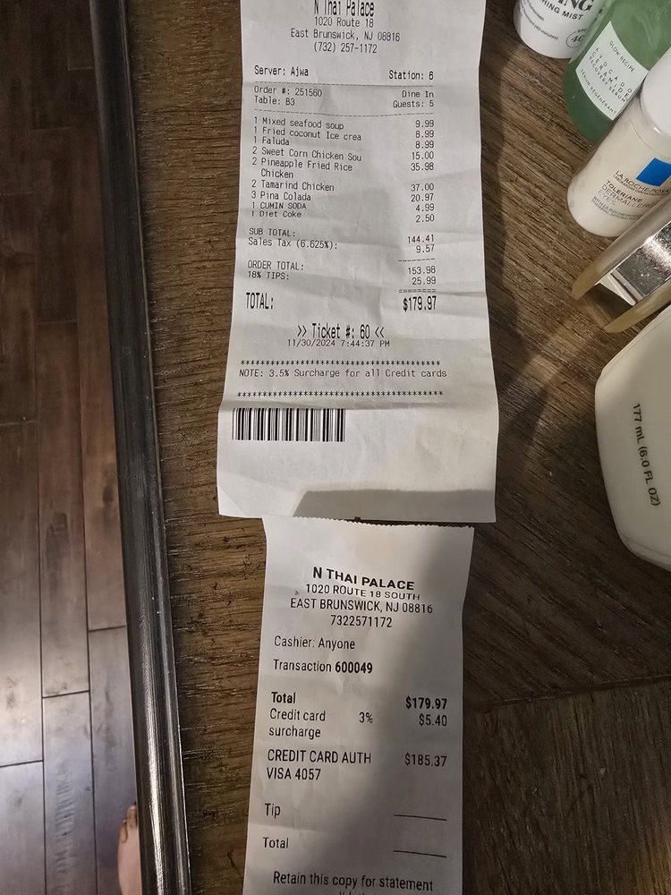 N Thai Palace, a halal Thai-Asian fusion restaurant in East Brunswick, NJ, offers a diverse menu with vegan and vegetarian options. Their spacious, wheelchair-accessible location provides a comfortable dining experience with private dining and outdoor seating available. Customers have raved about the flavorful dishes like red curry, hot garlic chicken, and drunken noodles, praising the generous portion sizes and fresh ingredients. The restaurant's commitment to quality and authenticity shines through in dishes like pineapple fried rice and Pad Thai noodles. While some customers noted slower service during peak times, the overall consensus is that N Thai Palace delivers on taste and variety. Whether dining with family or friends, N Thai Palace promises an unforgettable dining experience with classic Thai flavors and charming ambiance. Make a reservation to enjoy their unique culinary delights.